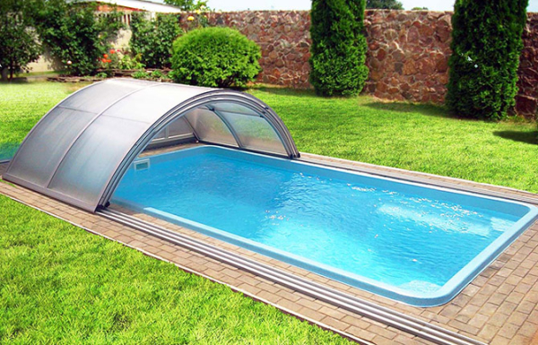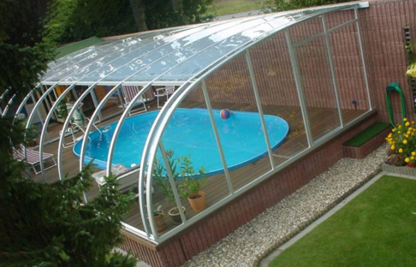 Для большинства владельцев бассейнов установка крыши над зеркалом водоема чаще всего связана с необходимостью защиты от домашних животных. Поэтому первое желание – сделать недорогой арочный колпак, который несложно устанавливать на ночь и убирать во время купания в бассейне.