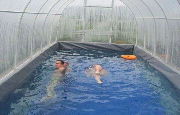 Многие дачники-владельцы открытых бассейнов для крытой надстройки используют готовые теплицы, собранные из алюминиевой трубы и поликарбоната или полиэтиленовой пленки.