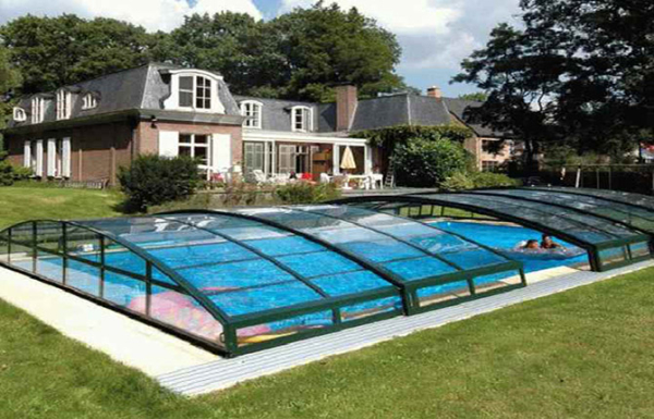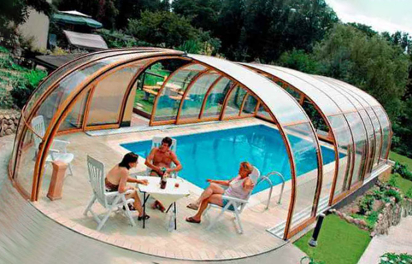 Существуют также купольные модели крытых бассейнов, у которых купол можно собирать в пакет, открывая часть зеркала для солнечного света.