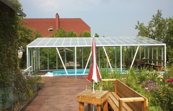Для небольших бассейнов часто используется распашная конструкция крыши, чтобы освободить водоем для купания, достаточно распахнуть или сдвинуть створки в сторону. Схема достаточно простая, но после распахивания створок защитного навеса над головой купающихся уже не будет.