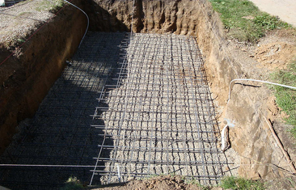 Далее укладывается толстая полиэтиленовая пленка и два слоя арматурной решетки. Арматуру заливают бетоном. Получается плита толщиной около 15 см. Поверх плитного фундамента нужно уложить слой пеноплекса, это утепление донной части бассейна.
