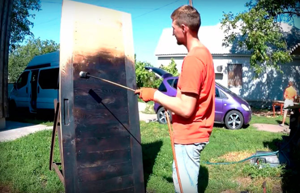 Старый дверной блок, полотно, наличники предварительно нужно будет обжечь от старого лака и краски.