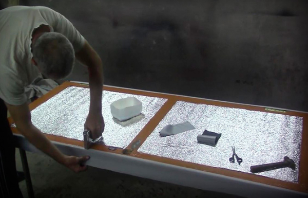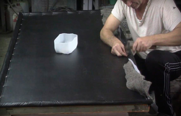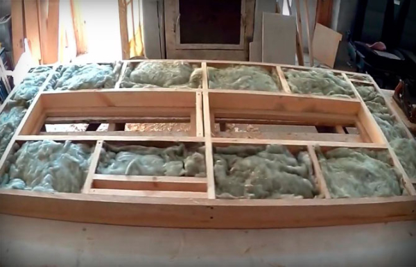 Следующий этап — обивка. Поверх утепления из войлока укладывается полотнище дермантина, кромки подворачиваются внутрь, по углам можно забить обойные гвозди, остальное пришивается ровненько к деревянному основанию скобами степлера.