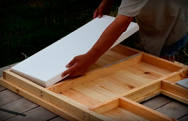 Из пенополистирола низкой плотности получается достаточно эффективное утепление. Листы из пенопласта П25 толщиной до 25 мм можно укладывать непосредственно внутрь дверного полотна.