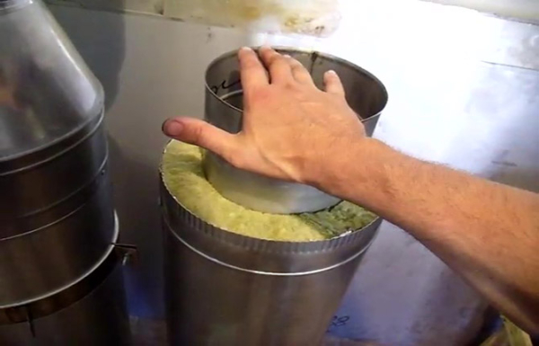 Каждая секция сэндвич-дымохода представляет собой двойную трубу из нержавейки, одна вложена в другую. В простенок между ними запрессована термоизоляция из базальтового волокна.