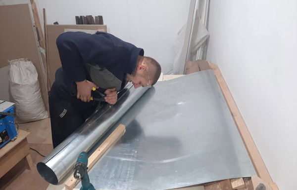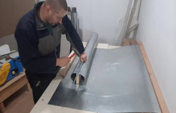 Процесс сборки дымохода для буржуйки начинается с разметки листа. Нужно отрезать заготовку шириной, равной длине окружности по торцу, плюс запас 40 мм на вальцованный шов.