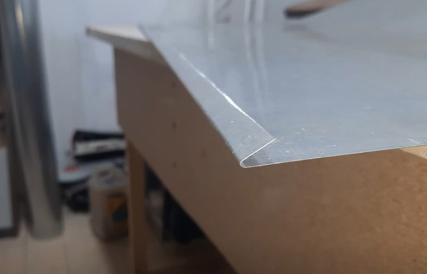 Далее лист укладывается с вылетом (20 мм) на край верстака и фиксируется струбциной.