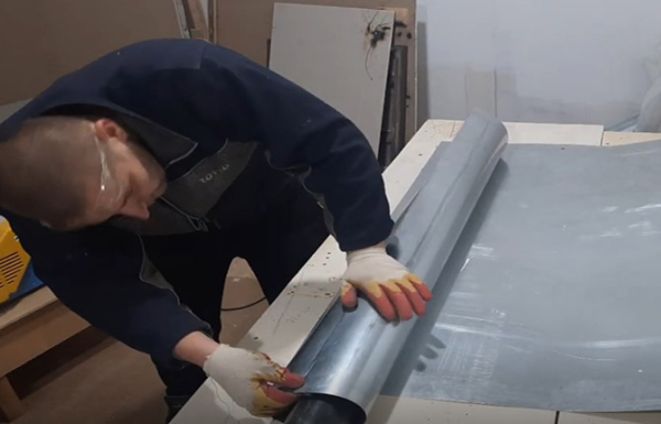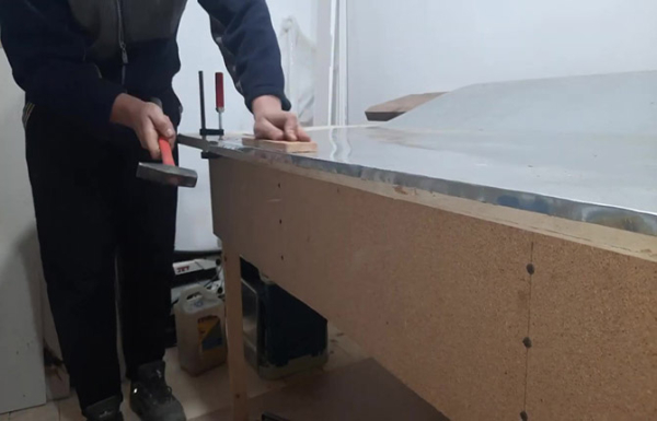 Прижимая нержавейку дощечкой, ударами молотка кромку листа отгибают под прямым углом. Далее заготовку переворачивают и загибают кромку до 120-160о.