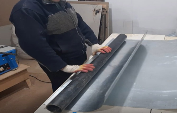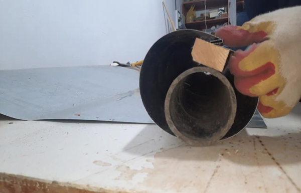 Далее лист-заготовку переворачивают «на спину», с помощью любой подходящей по диаметру болванки-оправки несколько раз скручивают нержавейку руками, пока материал не превратится в подобие трубы.