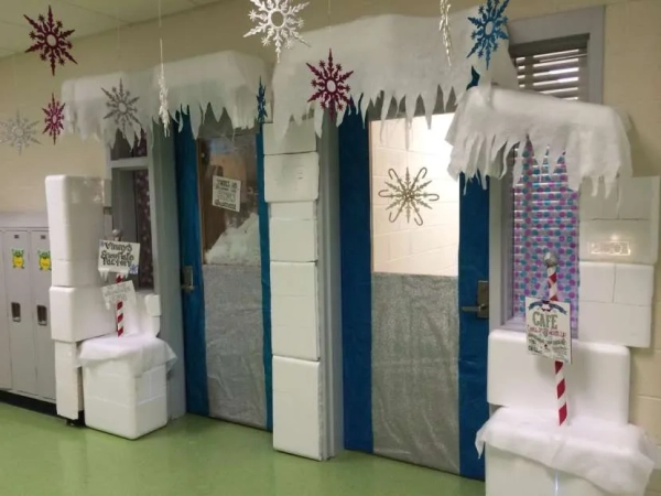 Для этого мероприятия стоит использовать тонкую разноцветную бумагу, так как она легкая. Из нее можно вырезать детали для персонажей, елочки, снежинки, буквы и прочие заготовки. А на раствор, например, из тертого хозяйственного мыла все отлично приклеится. Этот способ хорош кроме прочего и тем, что к украшению двери можно привлечь детей младших классов. Ведь занятие предусматривает простые действия с использованием безопасных материалов. В конце урока труда останется только собрать обрезки и вымыть руки с инструментами.
