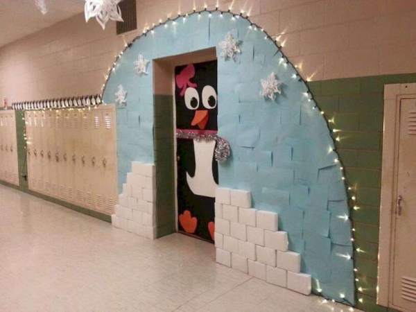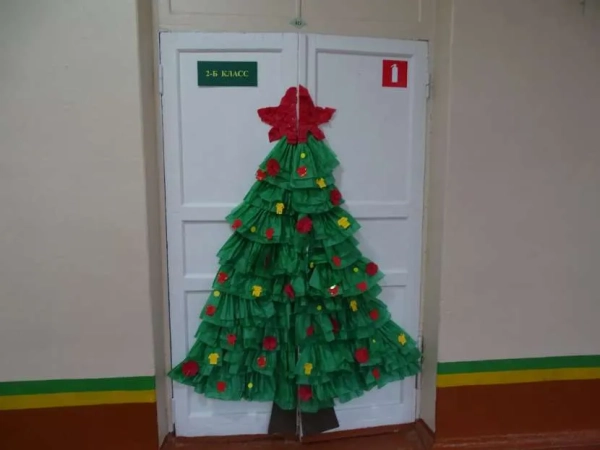У многих в памяти сразу возникает картинка с новогодним, а точнее с рождественским венком на двери, что чаще всего практикуется в европейских странах. В России эту традицию тоже переняли, но в основе своей располагаются украшения внутри жилых комнат. Относительно школьных просторов от этого решения безопаснее отказаться, так как сложно будет исключение падение венка с попутным повреждением шариков или колокольчиков на нем. Можно, конечно, надежно закрепить изделие с помощью нескольких полосок двустороннего скотча, специальными самоклеящимися пластинками с зацепами или на гвоздики. Но эти меры впоследствии приведут трудоемкому удалению остатков клея либо к повреждению целостности дверного полотна.