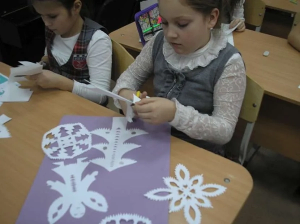 Здесь же можно создать 3-D украшения с помощью учеников. Простой вариант – многослойные снежинки, имитация елочных веток, игрушек и прочие замыслы. Способ посложнее подходит для тех, кто увлекается моделированием либо любит собирать макеты из бумаги. В любом случае, для детей это может стать увлекательным и полезным с точки зрения развития занятием.