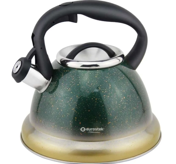 - EuroStek ESK-3090. Чайник от российской торговой марки выделяется интересным видом и «правильной» конусообразной формой. Модель оснащена звонким и мелодичным свистком, вмещает 3 л воды. Чайник хвалят за быстрый нагрев и нарядный вид (можно ставить на стол). Некоторые пользователи сообщали, что, после долгой эксплуатации, начал ржаветь носик.