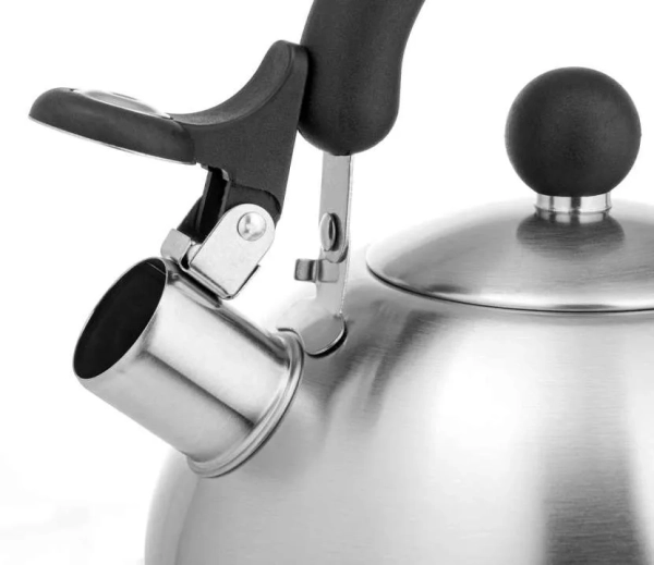 - По открыванию. Классические съемные свистки-насадки можно снять и надеть, что удобно, если вы хотите попить чайку поздно вечером. Варианты с рычажком, когда свисток поднимается и опускается на носик, иногда могут обрызгать кипятком (характерно для дешевых моделей). Самая удобная и безопасная конструкция – с курком на ручке; позволяет наливать воду, держа чайник одной рукой.