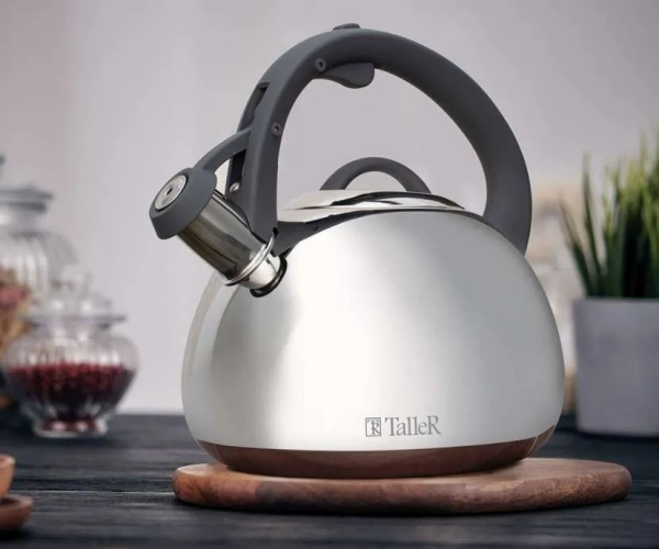 - Lara LR00-40. Чайник объемом 2,5 л приятно выделяется стильным утилитарным дизайном, который впишется в любой кухонный интерьер. Есть свисток и складная ручка, что удобно для хранения и перевозки. Модель с корпусом из нержавейки сделана в Китае, пользователи отзываются о свистке как о громком и мелодичном. Минус: сильный нагрев ручки.