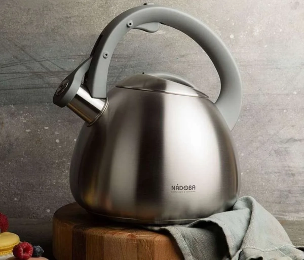 - Nadoba Virga. Бренд Nadoba из Чехии является подразделением немецкого концерна, что напрямую отражается на качестве: использовании добротных материалов и технологии капсульного дна. Стальной корпус в форме полусферы с матовой полировкой вмещает 2,8 л, есть свисток. К плюсам относят носик с широким отверстием и громкий, но мелодичный звук, не вызывающий раздражения. Минус: нагревание ручки.