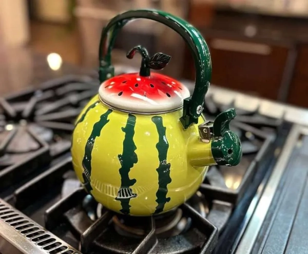 Второй по популярности вариант – чайник из стали, покрытой эмалью. Модели из эмалированной стали выгодно выделяются разнообразием цветовой гаммы, узорами и рисунками; такой экземпляр вполне может стать изюминкой кухни. Вода после кипячения в эмалированной посуде не меняет вкус, а эмаль не боится перепадов температуры.