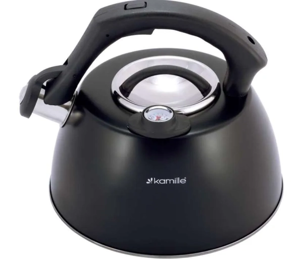 - Kamille KM-1077A. Стильный вариант с черной нейлоновой ручкой и свистком, который можно зафиксировать кнопкой (чтобы не свистел). Есть термометр, объем составляет 3 л. Благодаря использованию качественных материалов и новейших технологий чайник подходит для газа и индукции. Некоторые пользователи жалуются, что неудобно наливать воду, а после кипячения вода приобретает химический привкус.