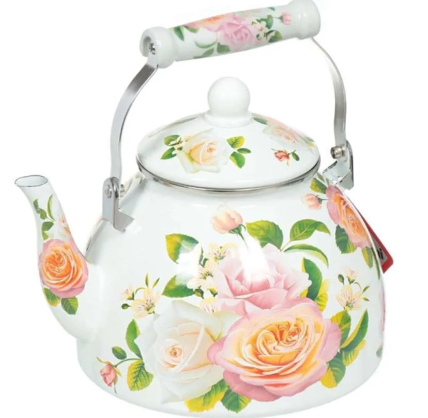 - Metalloni EM-401X1/46 «Нежная роза». Такое изделие оценят поклонники винтажного стиля: стильный цветочный рисунок в нежных оттенках, тонкий изогнутый носик и приличная вместимость (4 л). Толщина стенок 0,6 мм, есть складная керамическая ручка. Плюсы: трехслойная эмаль и зачерненное дно для быстрого нагрева. Минусы: вес (1,5 кг), ручка греется, а ее крепление не слишком надежно.
