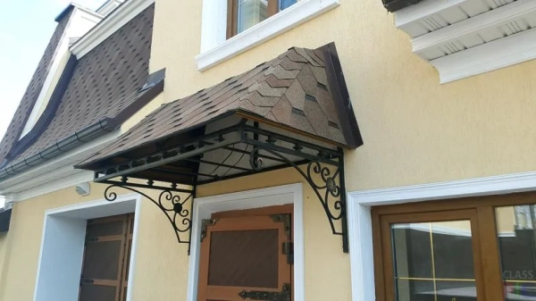 - Для кирпичного или каменного дома в классическом стиле хорошим решением станет металлический козырёк с элементами ковки.