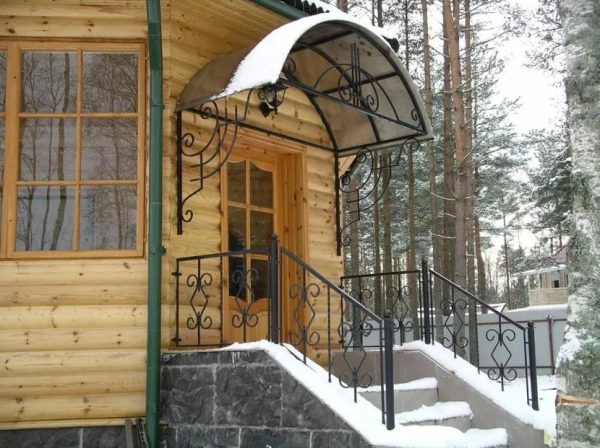 - Козырёк. Располагается над входной дверью и ступеньками, может быть частью крыльца. Такая архитектурная деталь украшает постройку и одновременно защищает порог от дождя и снега.