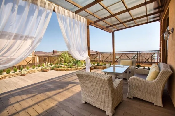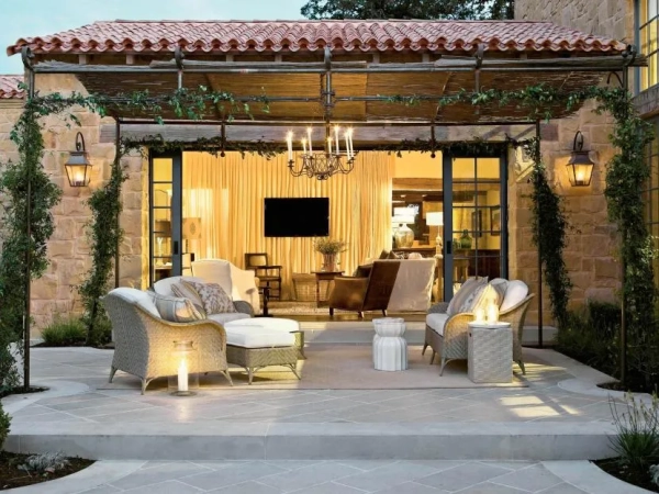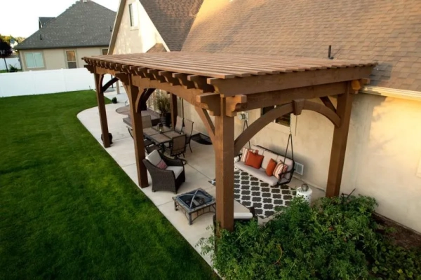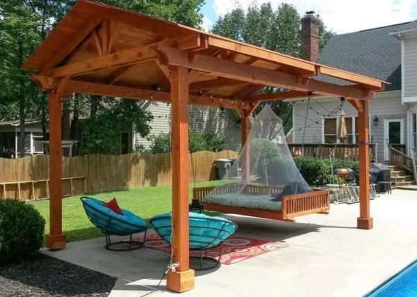 Каркас, как несущая часть конструкции, изготавливается из прочных материалов с высокими эксплуатационными характеристиками; наибольшее распространение получили деревянные и металлические постройки. Выбор кровельных материалов приятно разнообразен, что позволяет оформить навес в любом стиле. Завершающим штрихом станут дополнительные детали: освещение, растения, шторы, декоративные элементы.