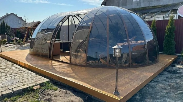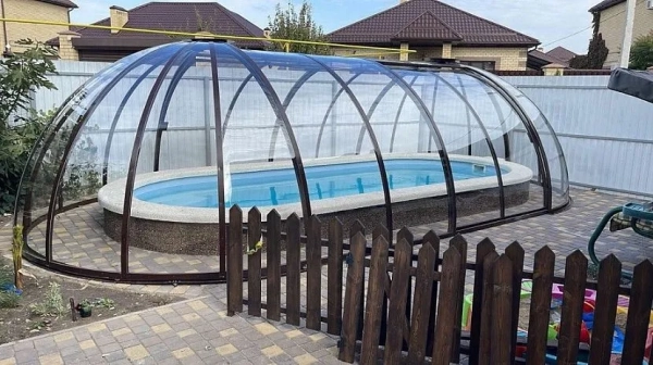 - Над бассейном. Здесь можно установить классический вариант без боковых стенок, или раздвижной, купольной формы. Он изготавливается из нескольких секций, способных перемещаться по направляющим.