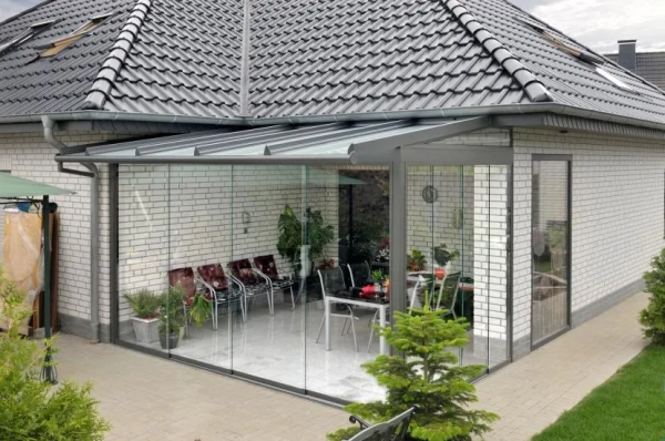 - Стекло. Оно не теряет своих характеристик со временем, а стеклянный навес будет выглядеть так же, как в день покупки, спустя много лет. Для навеса выбирают закалённое стекло, которому не страшны удары и колебания температуры.