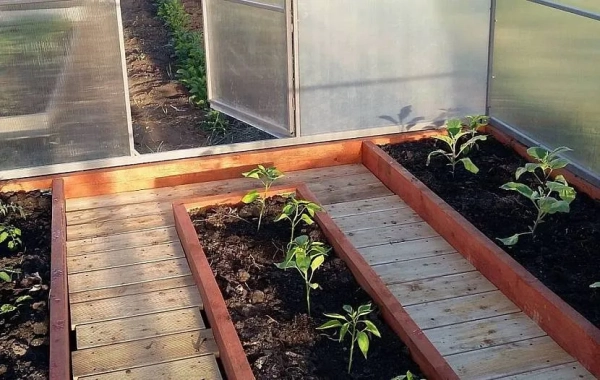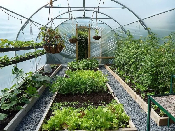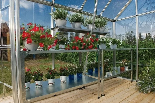 Если в теплице планируют выращивать рассаду, цветы или низкорослые растения, то уместны полки-секции. Расстановка парниковой «мебели» поможет рационально использовать полезные квадраты пространства. Конструкции можно совмещать с традиционными грядками.
