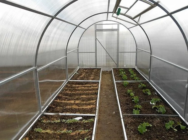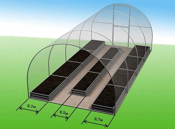 В компактных теплицах, шириной в 3 м, аграрии рекомендуют разместить два параллельных рядка по 1,2 м, прилегающим к стенкам конструкции. Между грядками идет дорожка, обеспечивающая доступ к культурам. Прямоугольные четырехметровые парники разбивают на 3 линии. Между грядками обустраивают тропки, шириной не менее 40 см.