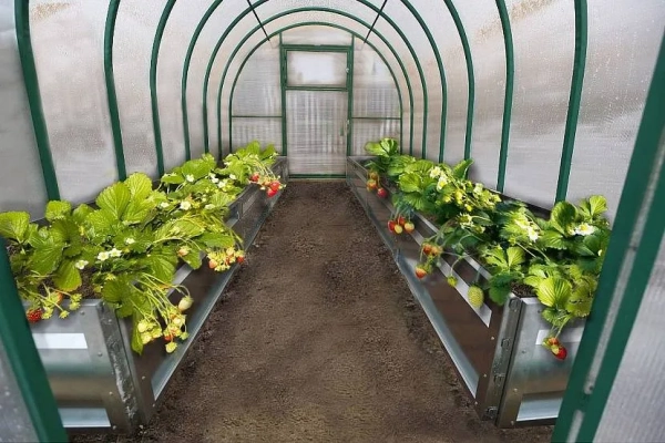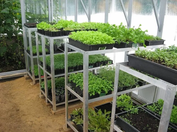 Вертикальная расстановка позволяет выращивать в теплице культуры разных видов. Средние и нижние полки удобны для взрослых растений, невысоких кустов и клубники. Рассаде нужен интенсивный свет, поэтому размещают на верхних ярусах. По мере развития контейнеры переставляют ниже. Простаивающее место под стеллажами земледельцы обустраивают для хранения инвентаря.