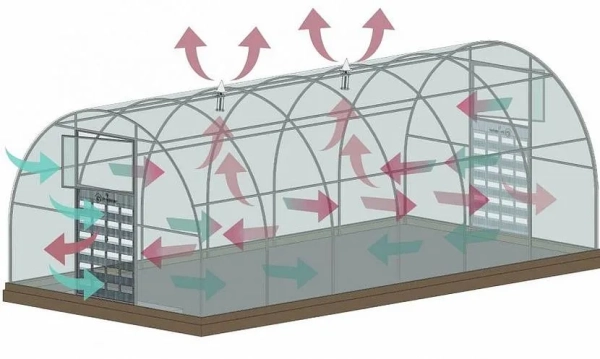 Летом автоматическое проветривание помогут обеспечить солнечные батареи и 2 вентилятора. Приборы располагают с противоположных краев теплицы: один ставят на выдув, второй – на вдув. С восходом солнца конструкция активируется, с закатом – выключается. В пасмурную и дождливую погоду устройство не работает.
