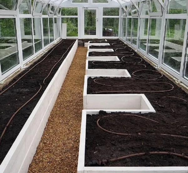 Легкость перемещения между грядками обеспечивают тропинки. Способ размещения зависит от вида парников и количества рядков. Аграрии рекомендуют в компактных конструкциях использовать одну центральную дорожку, шириной от 0,5 м. В габаритных теплицах красиво смотрятся параллельные проходы, между которыми высаживают растения.