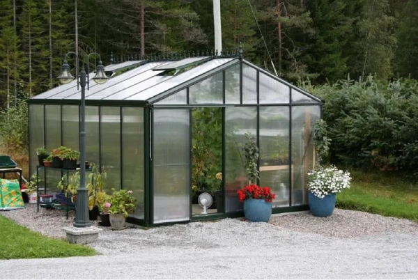 Традиционные теплицы-«домики» имеют вертикальные стены и наклонную крышу. Из-за особенностей строения потолка растения получают максимум освещения, идеально подходит для выращивания карликовых деревьев и высоких культур. На остроугольной конструкции не задерживается снег и стекают капли. За сооружением легко ухаживать, можно обустроить вентиляцию.