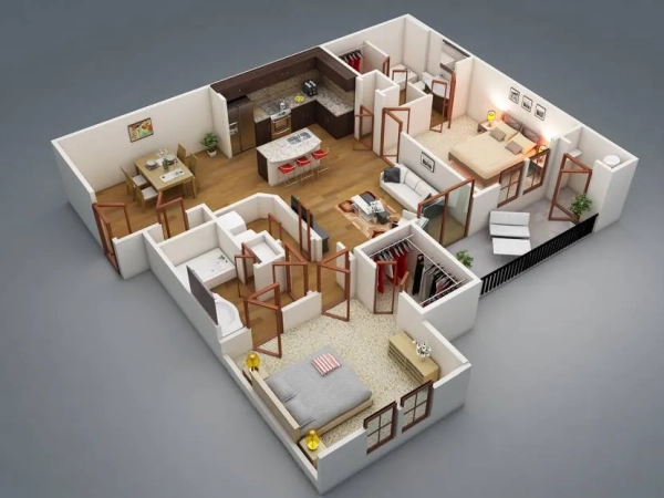 - Вид комнат. Они могут быть изолированными или смежными. Изолированные помещения более удобны, но, если комнат много, не обойтись без коридоров, которые съедают жилую площадь.