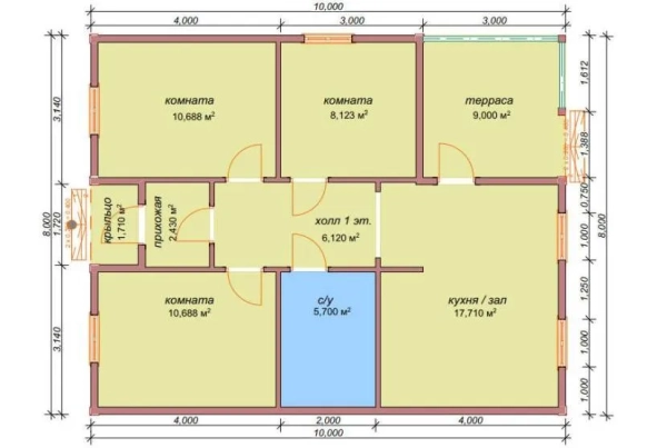 Одноэтажное жилье выгодно в экономическом отношении: на него тратится меньше материалов, дешевле обходится прокладка коммуникаций (водопровода, отопительной системы, канализации). Грамотная планировка дома 8 на 10 одноэтажного формата имеет следующие особенности:
