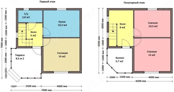- Пространство удобно делится на две части: внизу располагается дневная зона общего пользования, сверху достаточно места для двух спален и полноценной ванной. На первом этаже оборудуется только санузел.